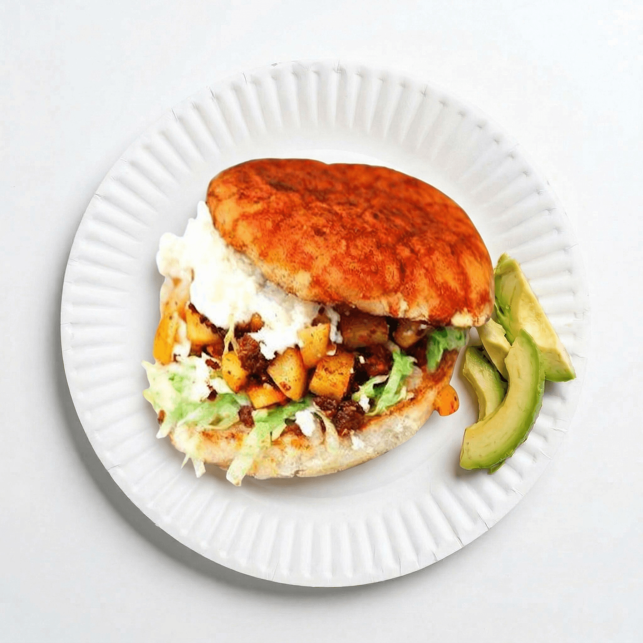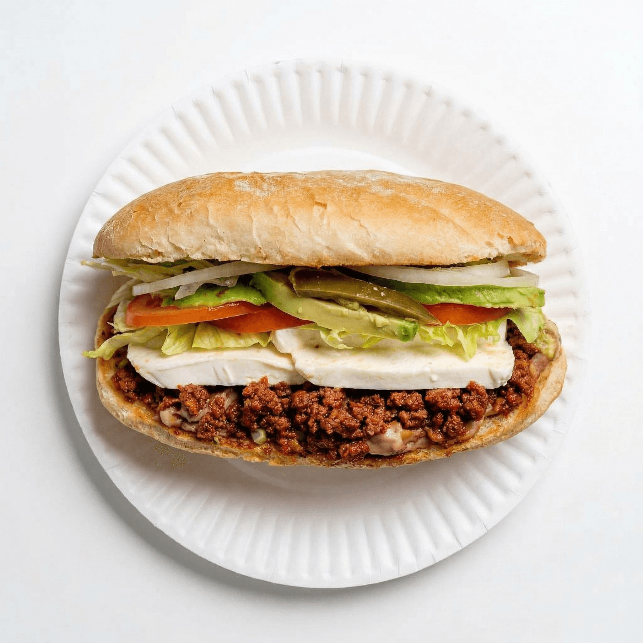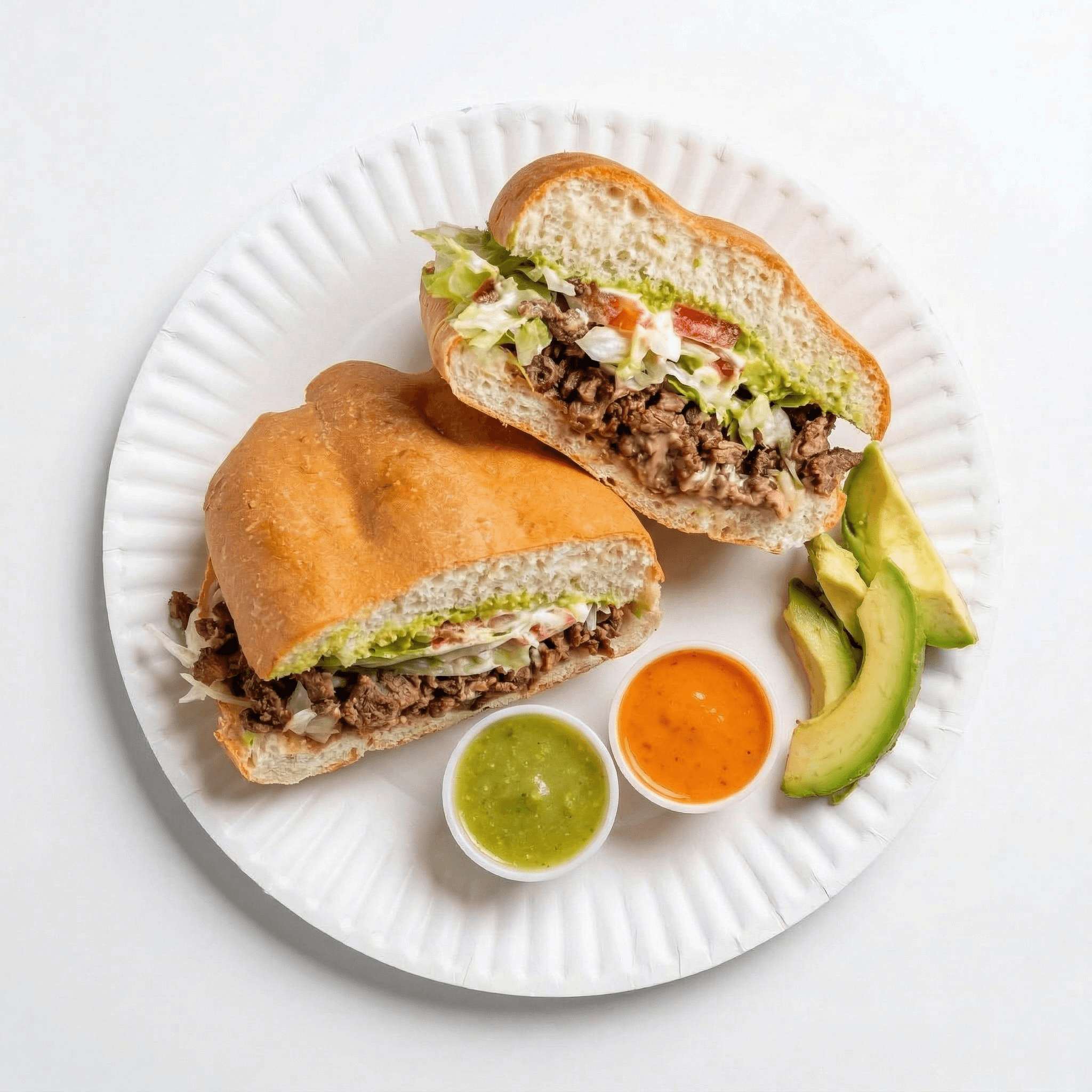 Mayo, beans, meat, cheese, lettuce & avocado. Con arroz y frijoles/with rice and beans for additional charge